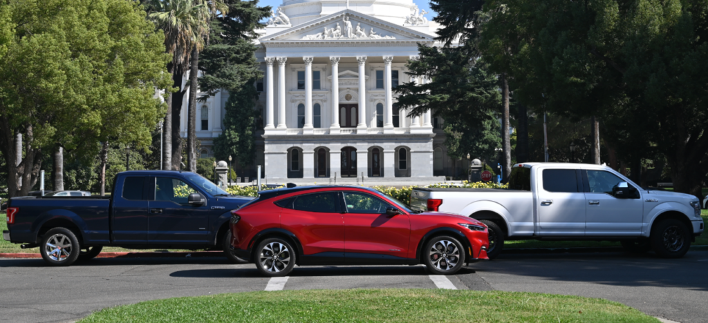 Little did I know, that next morning, California Governor Gavin Newsom would make massive news, announcing that California will phase out the sale of new combustion engine vehicles by 2035, with the vision of a truly electric future for the Golden State. In the background of the televised announcement is my car, along with a Telsa, Audi, and Honda. When it came time to sign the order Governor Newsom said, “We’re going to pick the Ford, only because we’re appreciating Bill Ford’s leadership” and to my surprise he approached the vehicle – my vehicle! In front of cameras and reporters, the Executive Order was signed right there on the hood of the my shiny red all-electric Ford Mustang Mach-E. I was there to witness this symbolic gesture in recognition of our siding with California’s strict clean air standards.
